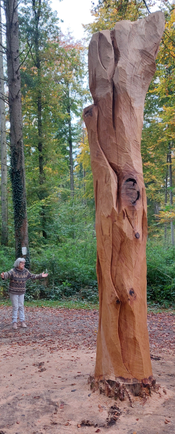 Aus einen mächtigen Eichenstamm, der aus dem Wald beim Krummbach in Ochsenhausen stammt, erschafft die Kunstschaffende Theresia K. Moosherr mit der Kettensäge eine ihrer unvergleichlichen Wasserhüterinnen. Sie wird wie ihre anderen über fünfzig Schwestern an der Donau, dem Bodensee und dem Neckar daran erinnern wie kostbar Wasser ist auf der ganzen Welt.